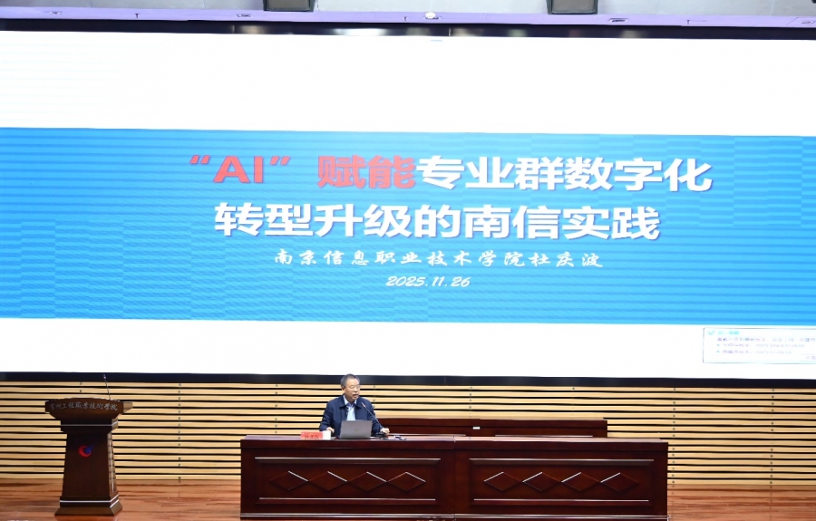 报告会上,杜庆波教授以“AI赋能专业群转型升级的南信实践”为题,聚焦专业数字化转型、教师数字素养提升、教学模式数字化创新、治理体系数字化重构四大核心维度,结合南京信息职业技术学院“人工智能赋能发展三年行动计划”及“‘十五五’专业建设规划”等具体实践案例,从理论支撑、目标导向、实施路径、保障机制等多个层面,系统阐释了人工智能与专业群建设深度融合的核心逻辑与实践策略。杜教授指出,专业数字化转型不仅是技术工具的引入,更是教育理念、课程体系、教学方法和评价机制的全方位重构。在教师数字素养提升方面,他分享了南京信息职业技术学院通过分层培训、项目驱动、校企共建等方式,系统提升教师AI应用能力与创新教学能力的有效做法。在教学模式创新维度,杜教授重点介绍了基于AI的个性化学习路径设计、虚拟仿真实践教学、智能课堂互动等新型教学形态如何有效提升教学效果与学生参与度。在治理体系数字化重构方面,他强调了数据驱动决策、智能管理平台建设以及跨部门协同机制在优化专业群治理效能中的关键作用。整场报告内容翔实、案例生动,既有宏观视野的战略思考,又有可操作性的实践指引,为与会人员带来了一场兼具前瞻性与落地性的高水平分享,也为我校推进人工智能与专业建设深度融合提供了宝贵参考。